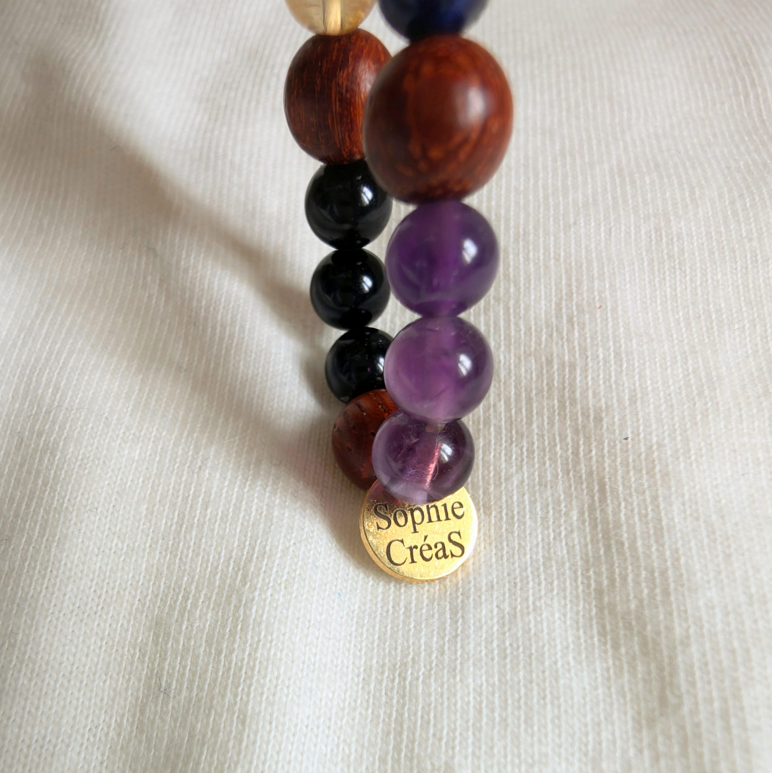 Dans le « Bracelet 7 Chakras » de Sophie CréaS, les pierres semi précieuses font 6mm et les 7 perles en bois de Bayong, (Le Bayong est un bois exotique des Philippines) mesurent 8mm. Les bracelets sont élastiques pour un tour de poignet d’environ 17 cm.